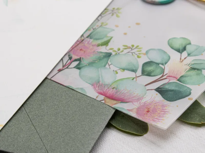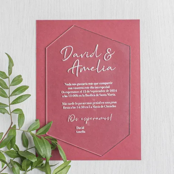 Incorpora vellum (papel vegetal) en tus invitaciones para un efecto suave y etéreo. Ideal para crear capas y dar un toque moderno y elegante.