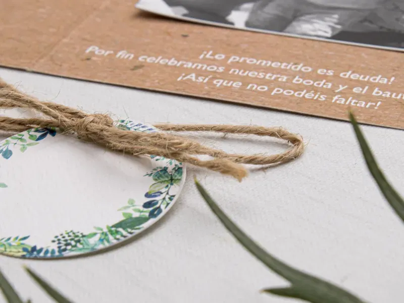 Añade una etiqueta con cuerda a tus invitaciones para un acabado rústico y encantador. Perfecta para escribir nombres o pequeños mensajes.